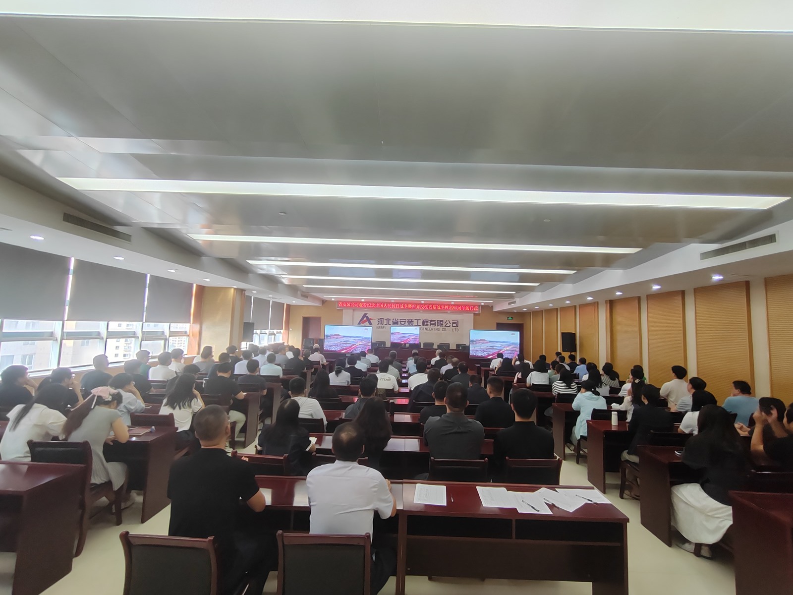 2025年9月3日,為紀(jì)念中國人民抗日戰(zhàn)爭暨世界反法西斯戰(zhàn)爭勝利80周年,河北省安裝工程有限公司積極組織職工集中觀看閱兵盛況直播。公司機(jī)關(guān)及各分公司、項(xiàng)目部共計(jì)2000余人通過多種方式同步參與,共同回顧歷史、緬懷先烈、展望未來。上午9時(shí),習(xí)近平總書記發(fā)表重要講話,9時(shí)19分大閱兵正式開始,公司機(jī)關(guān)及各分公司、項(xiàng)目部會議室座無虛席,職工們們整齊地坐在屏幕前,神情莊重地注視著電視畫面。在閱兵式過程中,